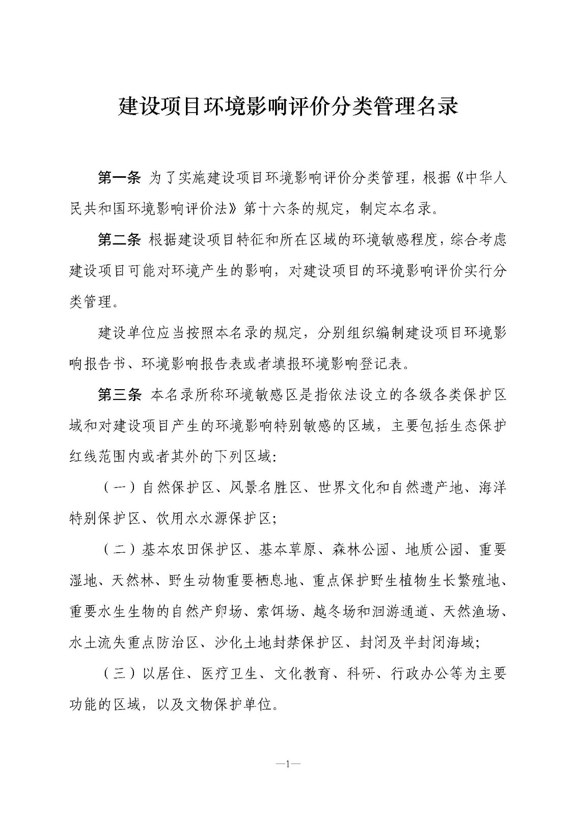 第三條 本名錄所稱環境敏感區是指依法設立的各級各類保護區域和對建設項目產生的環境影響特別敏感的區域,主要包括生態保護紅線范圍內或者其外的下列區域:
